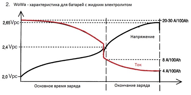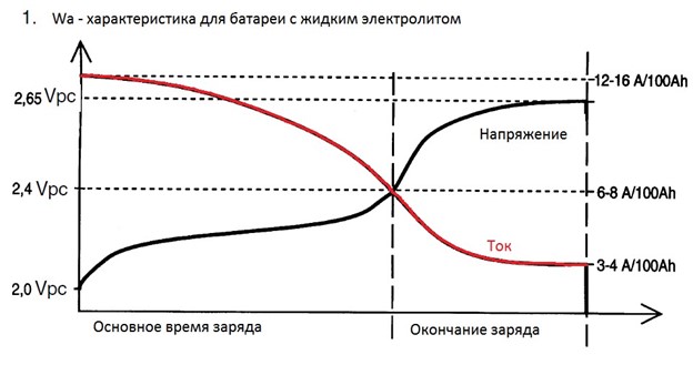 Як видно, на критичній ділянці від 2,4 В до 2,65 В заряд здійснюється стабільним, відносно невеликим струмом, що не залежить від коливань мережі. Це в окремих випадках дозволяє не проводити контроль температури електроліту.