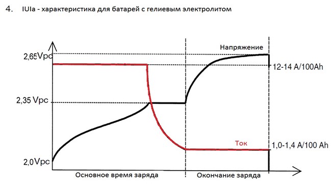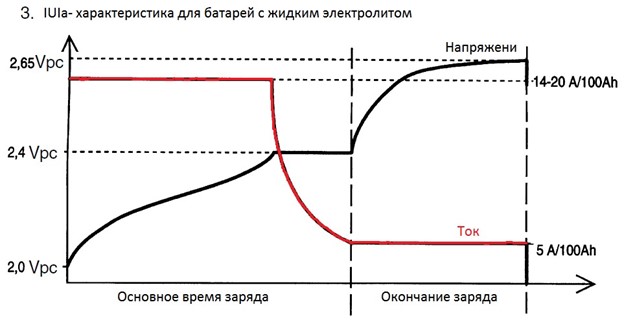 При формуванні характеристики IUIa на початковій ділянці заряду встановлюється струм дещо нижчий, ніж у профілі WoWa, що дозволяє менше навантажувати АКБ. Далі заряд здійснюється стабільним струмом, незалежно від коливань мережі, до напруги 2,4 В.